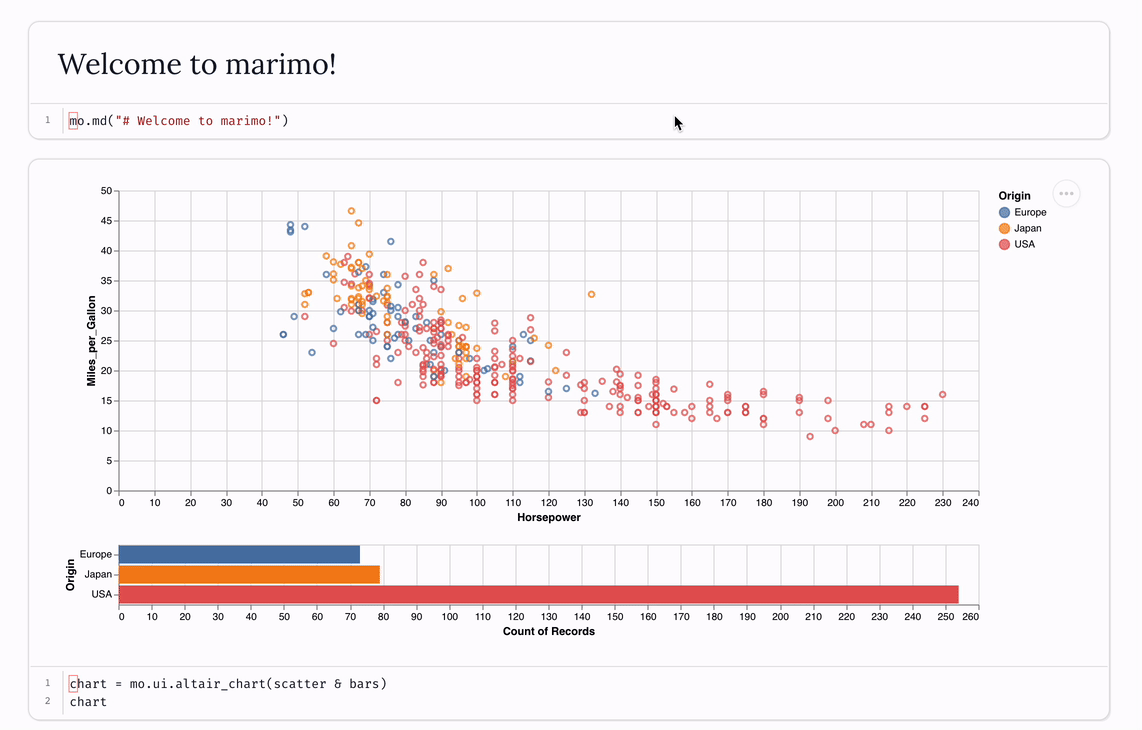 marimo supports reactive plots via mo.ui.altair_chart! Select and filter with your mouse, and marimo automatically makes the selected data available in Python as a Pandas dataframe!